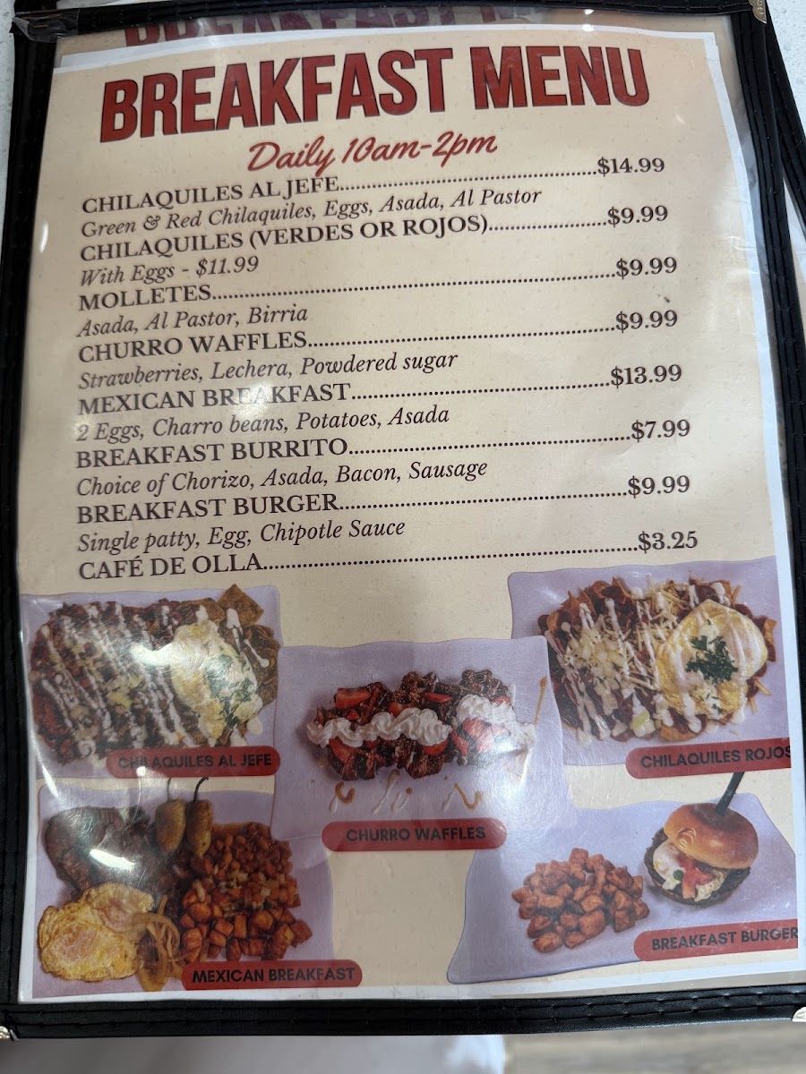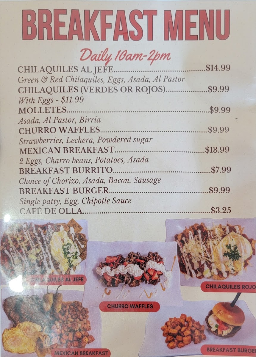 If you're in the mood for something more adventurous, don’t miss the Sushirito, a fusion of sushi and burrito, perfect for those who want a bit of everything in one bite. The Breakfast section also shines, with mouth-watering options like the Mexican Breakfast, the hearty El Jefe Chilaquiles, and the sweet indulgence of Churro Waffles. The Breakfast Burger is another favorite for those who crave a more filling morning meal.