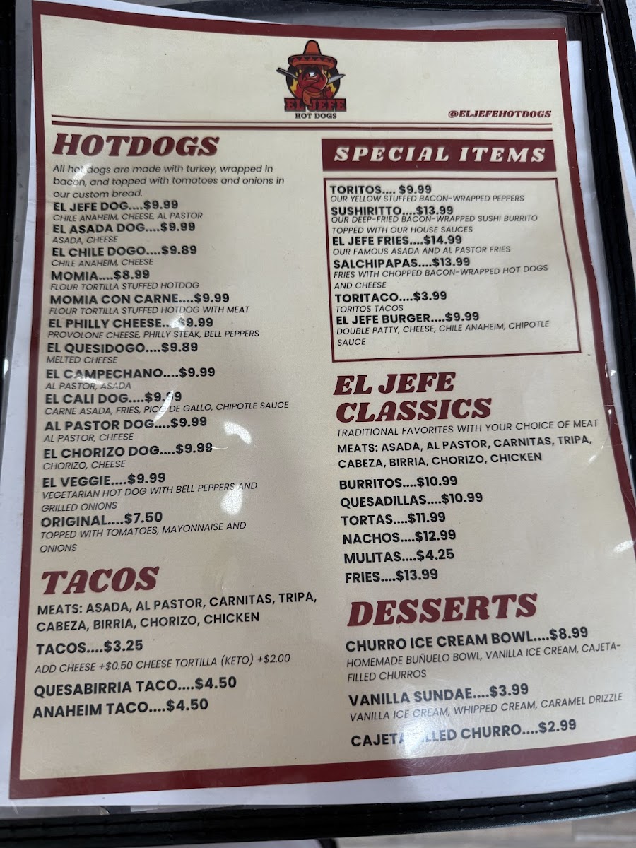 Overall, El Jefe Hot Dogs combines a variety of delicious, fresh options with a unique twist on classic dishes, ensuring that everyone finds something they love on the menu. Whether you’re in the mood for a gourmet hot dog, a satisfying taco, or a filling breakfast, this place delivers every time.