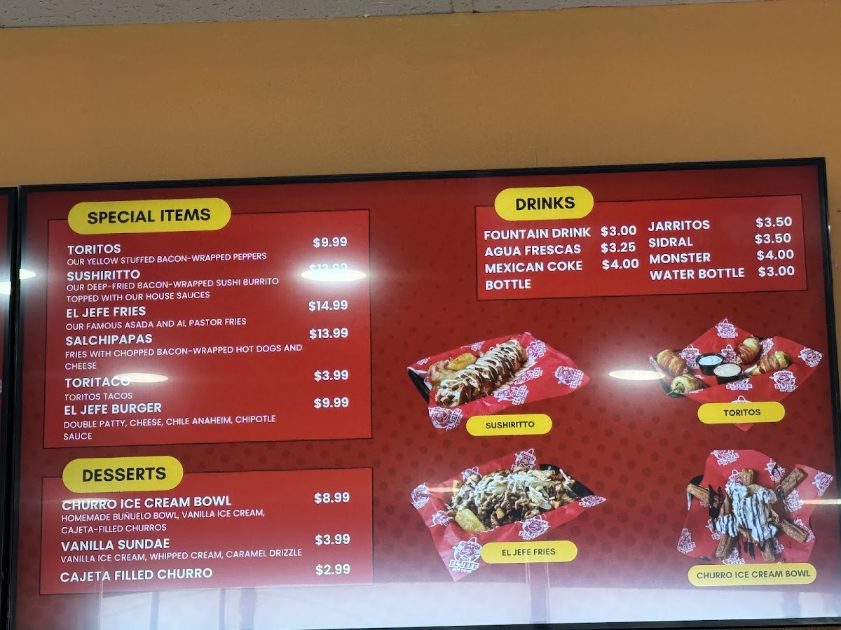 To wash down your meal, they offer refreshing drinks such as a Coke Bottle or a Topo Chico, perfect for quenching your thirst after a savory bite. And no meal is complete without a side-El Jefe Fries and Salchipapas are the perfect companions to any dish, offering a crispy, flavorful side that pairs perfectly with their bold main courses.